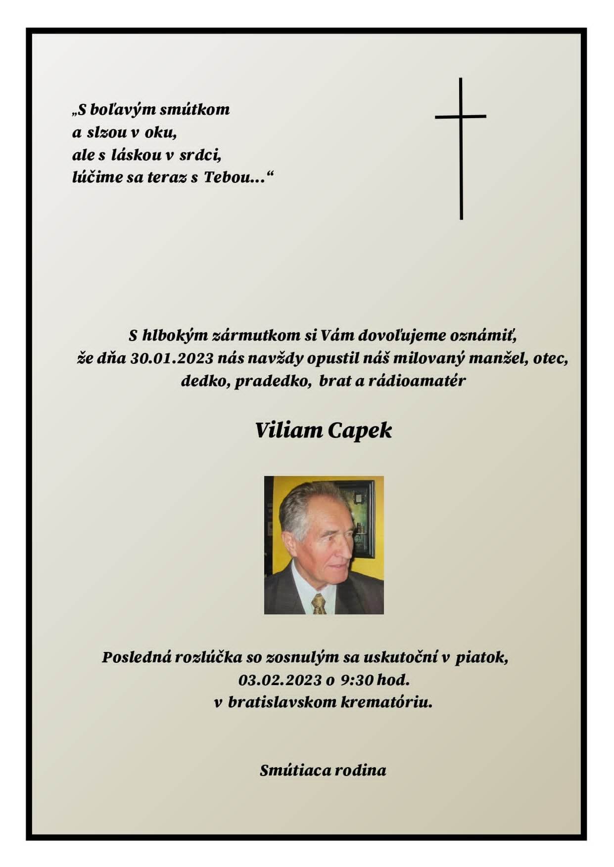 Vo veku 84 rokov dňa 30. januára 2023 nás opustil známy slovenský rádioamatér, dobrý priateľ, vynikajúci konštruktér Viliam Capek, OM3CV z Čadce, člen OTC SARA č. 300. Česť jeho pamiatke!