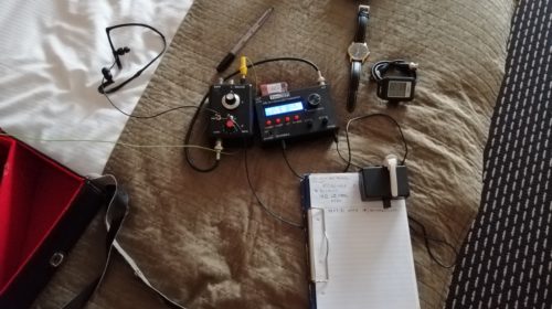 Po preverení možností ohľadom vysielania v USA, som si na cestu pribalil moju malú SOTA súpravu: Transceiver HB-1B s nabíjačkou, doma vyrobený anténny tuner, osvedčenú anténu 31 m drôt, rybársky 5 m teleskopický bič, ktorý sa vošiel bez problémov do kufra. Samozrejme slúchadlá, telegrafný manipulátor a ostatnú bižutériu, ako prepojovacie kábliky ap. Po určitých obavách som bol milo prekvapený na všetkých kontrolách v Prahe, vo Frankfurte a tiež v NYC-JFK, kade som prešiel bez problémov. Dokumentáciu som mal pripravenú (koncesiu, Harec, informácie ohľadom akceptácie CEPT-u, doklad o možnosti prevozu li-ion akumulátorov), všetko bolo v angličtine, nikto už nepožadoval žiadne iné doklady. Kompletné zariadenie, okrem rybárskeho teleskopu, som mal so sebou na palube lietadla, v príručnej batožine. Po deklarovaní na colnici na otázku colníka čo to mám, som odpovedal skromne „rádio“. Každý sa len usmial, že rádio, „no problem“.