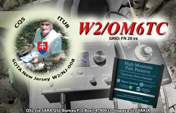 Po odskúšaní, že to na pásmach chodí aj z USA, dohodli sme si cestu a termín na kótu. 26. júna 2019 sme dorazili asi po hodinovej ceste autobusom na obrovské parkovisko pri William Paterson University. Nebolo tam ani živej duše ktorá by nám poradila, kde je ďalšie parkovisko, ako východiskový bod cesty na High Mountain W2/NJ-008. Po kratšom pátraní sme narazili na domorodca, ktorý nás nasmeroval na malé parkovisko, z ktorého išla cesta na kótu. Našli sme tam mapky, smerovky a hlavne červené značkovanie, ako u nás. Po červenej, asi tak po hodinovom šliapaní cez zmiešaný les sme prišli pod kótu. Slnko nemilosrdne pálilo, preto sme zostali kúsok pod vrcholom schovaní v tieni. Natiahli sme anténu asi 4 m nad zemou a začal som volať výzvu. Mal som smolu, lebo v tom čase prebiehali nejaké preteky, moje dávanie výzvy s malým výkonom zanikalo medzi silnými signálmi. Asi po pol hodine sa mi konečne podarilo urobiť sedem spojení, čo bolo dostatočné na uznanie aktivácie. Keďže sme boli limitovaní odchodom autobusu, urýchlene sme zbalili zariadenie a ponáhľali sme sa dolu na zastávku. Cestu lesom sme si užívali, je tam pekná príroda, na ceste sme stretli korytnačku. Okrem tej korytnačky sme sa cítili ako doma. Na zastávku sme prišli v limite, chlapci si stihli dať aj cigaretku. Po príchode do NYC sme náš úspech zapili pivkom v blízkom bare.